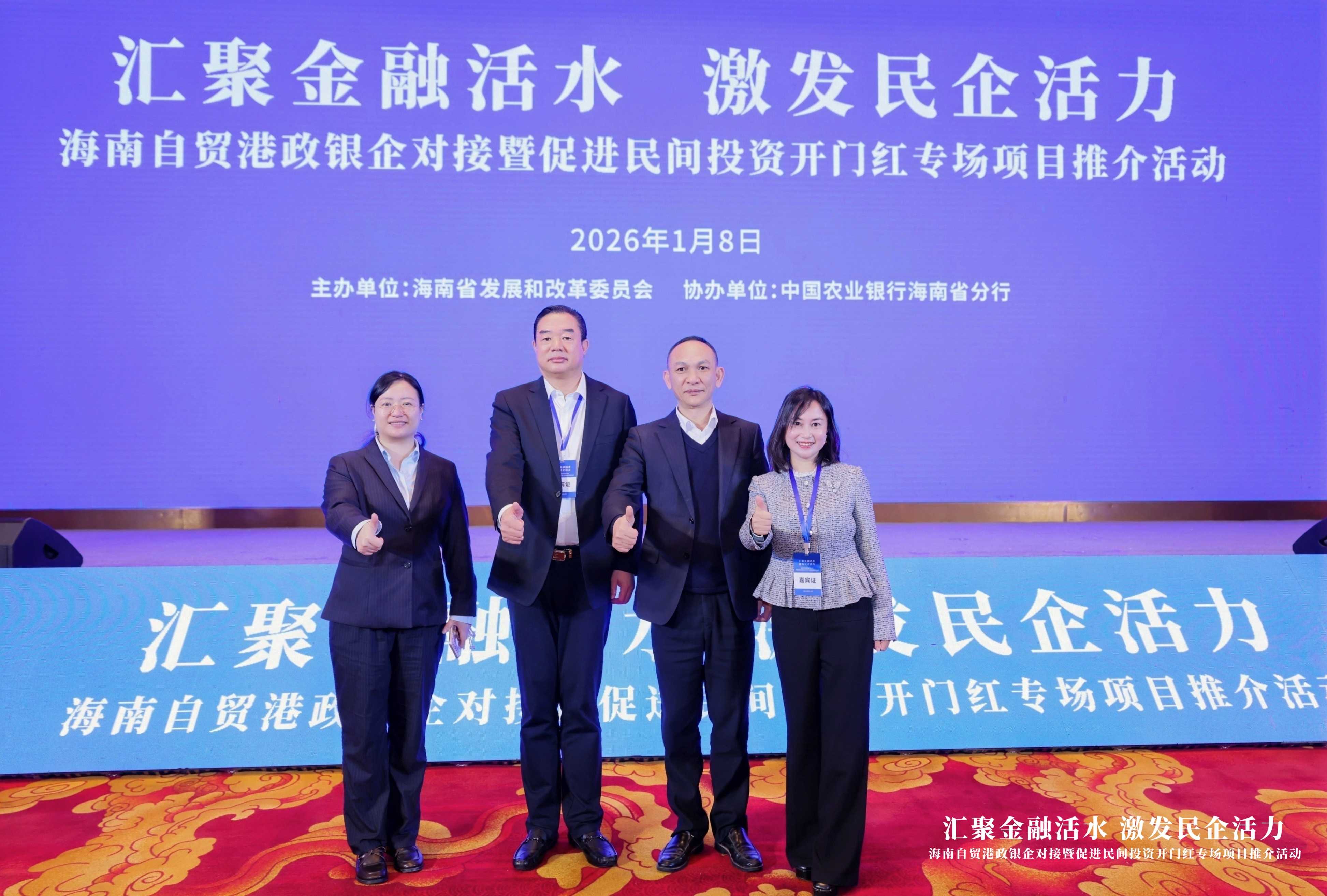為深入貫徹落實(shí)國家及海南省關(guān)于擴(kuò)大有效投資、激發(fā)民間投資活力的決策部署,搭建民間投資項(xiàng)目與金融資源的精準(zhǔn)對接平臺,2026年1月8日,由海南省發(fā)展和改革委員會主辦的“匯聚金融活水 激發(fā)民企活力”——海南自貿(mào)港政銀企對接暨促進(jìn)民間投資開門紅專場項(xiàng)目推介活動”在??诼≈嘏e行。本次活動旨在搭建政銀企精準(zhǔn)對接平臺,暢通融資渠道,激發(fā)企業(yè)活力。公司總經(jīng)理顏利、副總經(jīng)理兼財(cái)務(wù)總監(jiān)吳燕受邀參加了本次活動。